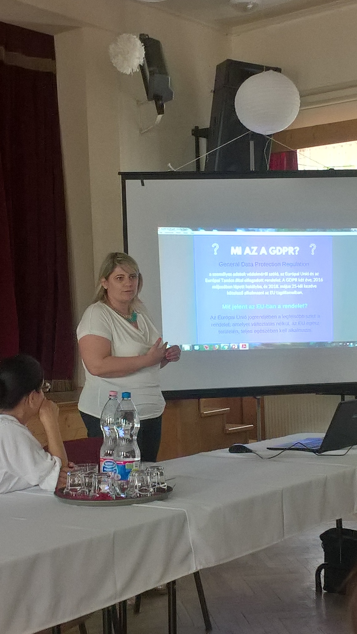 Szükség is volt egy kis felszabadult nevetésre, mert a délelőtt zárásaként a most szintén nagyon időszerű, és napjainkat átszövő adatvédelmi szabályokról beszélt Genczinger Ildikó. A legtöbben hallottak már róla (hiszen az élet minden területén megjelenik, nemcsak a könyvtári világban), de szükség volt egy rövid, tényszerű áttekintésre, hiszen már csak bő egy hét, és érvénybe lép az új jogszabály, amire a könyvtáraknak és a könyvtárosoknak is fel kell készülniük. A jogszabály nagyon szerteágazó, és nehezen követhető. Nagyon sokat kell még tanulnunk, és nagyon sok tapasztalatot kell összegyűjtenünk, de feltétlenül szükséges, hogy mindenki tisztában legyen az alapokkal, és azzal, hogy ez a szabályozás az ő munkáját és mindennapjait érinti.